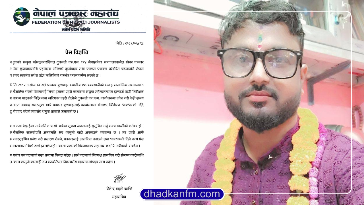 सर्लाही – धनुषाको क्षिरेश्वरनाथ नगरपालिका – ५, सखुवा महेन्द्रनगरस्थित दुधमती एफ.एम. १०४ मेगाहर्जका सञ्चालक तथा पत्रकार अनिल कुशवाहामाथि प्रहरीद्वारा दुर्ब्यबहार भएको घटनाप्रति नेपाल पत्रकार महासंघले आपत्ति जनाएको छ।