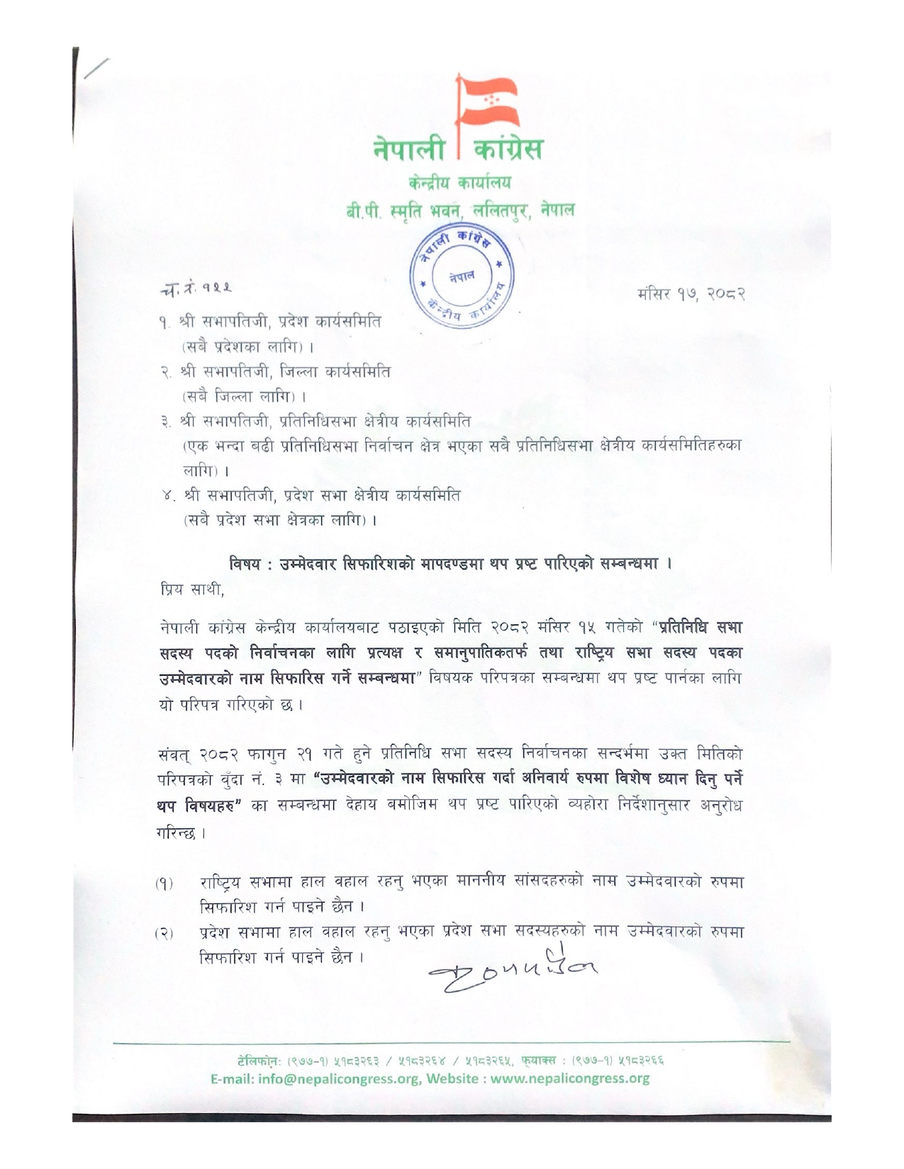 नेपाली कांग्रेस केन्द्रीय समितिको निर्णय अनुसार प्रदेश सभामा हाल वहाल रहेका प्रदेश सभा सदस्यको नाम प्रतिनिधि सभा उम्मेदवारका रूपमा सिफारिस गर्न पाईदैन। तर मंगलबार बसेको क्षेत्र नं. ४ को बैठकले हाल मधेश प्रदेश सभा सदस्य वीरन्द्र प्रसाद सिंहको नाम प्रतिनिधि सभामा प्रत्यक्षतर्फ सिफारिस गरेको छ। उनका साथै क्षेत्र नं. ४ बाट पार्टीका महामन्त्री गगन थापाको नामसमेत सिफारिस गरिएको छ।
