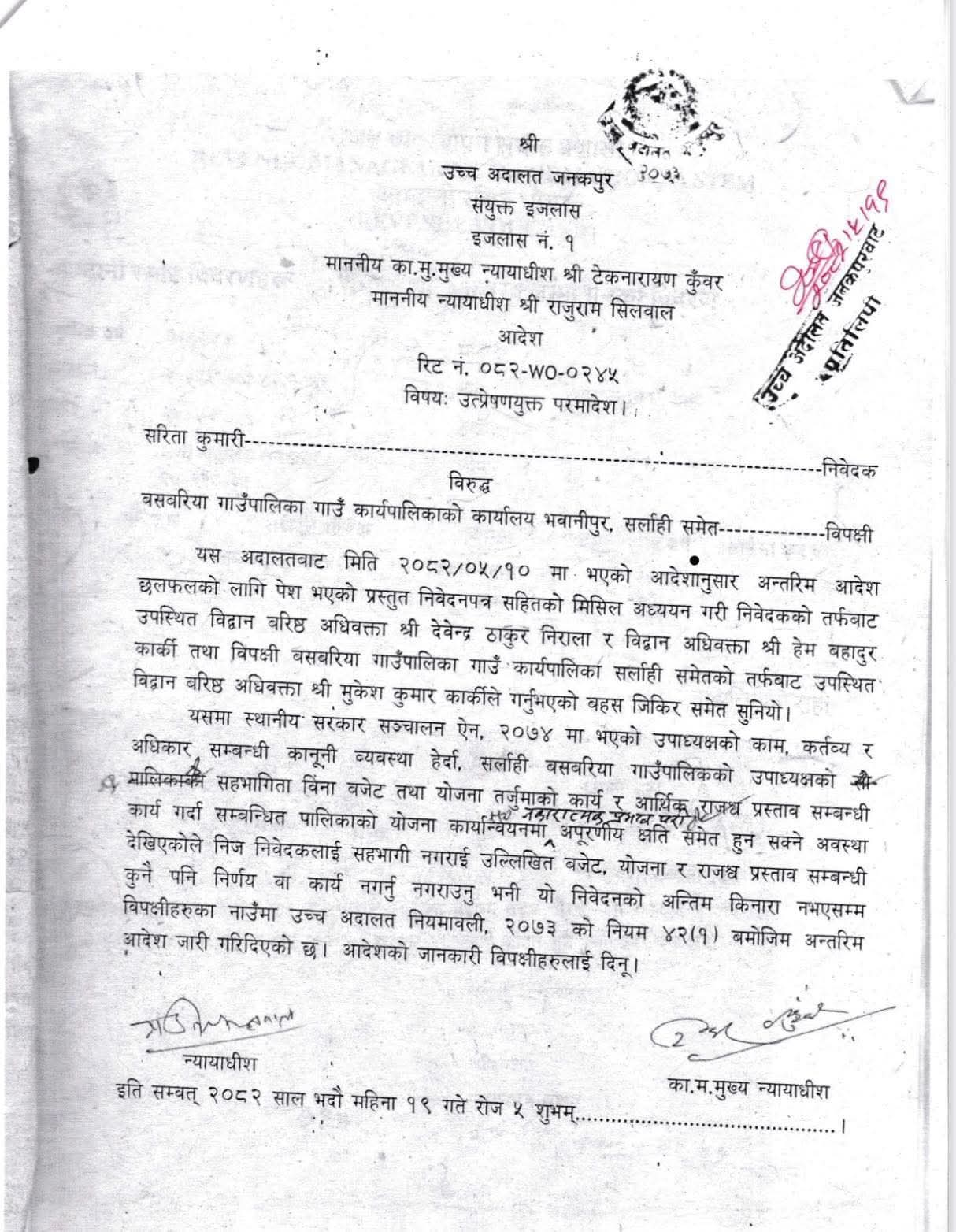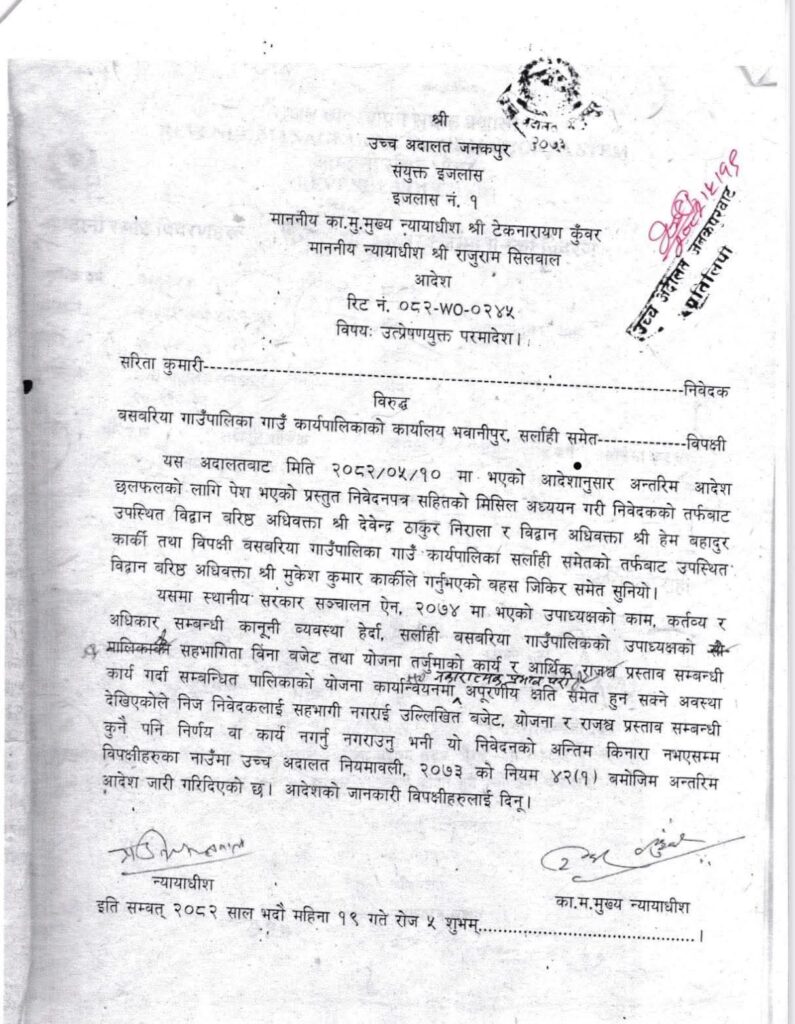 निवेदनमाथि सुनुवाइ गर्दै उच्च अदालत जनकपुरले गाउँपालिका उपाध्यक्षको सहभागिताबिनै बजेट, योजना तथा राजस्व प्रस्तावसम्बन्धी कुनै पनि कार्य नगर्न अन्तरिम आदेश जारी गरेको थियो। साथै अदालतले मुद्दाको अन्तिम किनारा नलागेसम्म कुनै पनि निर्णय वा कार्य नगर्न स्पष्ट आदेश दिएको छ।