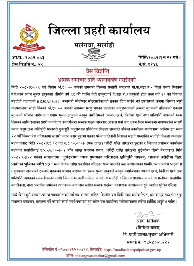 यसैबीच, पिडितले पत्रकार सम्मेलनमा लगाएका आरोपका आधारमा लेखिएको समाचारलाई जिल्ला प्रहरी कार्यालय सर्लाहीले भ्रामक समाचार भनेको छ। साथै, पीडित पक्षलाई आवश्यक कागजातसहित सम्बन्धित निकायमा सम्पर्क गरी क्षतिपूर्ति प्रक्रिया अघि बढाउन पुनः अनुरोध गरिएको छ ।