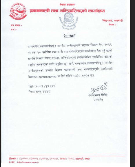 कार्यालयले जारी गरेको सूचनामा सम्पत्ति विवरण कार्यालयको आधिकारिक वेबसाइट www.opmcm.gov.np मार्फत हेर्न सकिने व्यवस्था गरिएको जनाएको छ ।